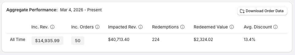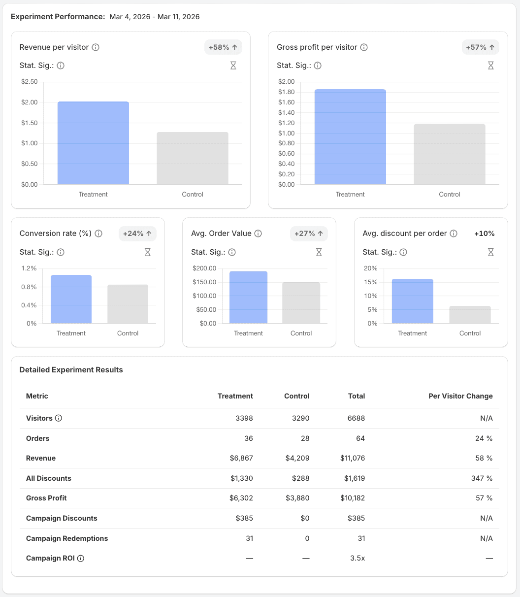 Promi offers a built-in A/B testing platform to measure the impact and statistical significance of your campaigns. These experiments can be set up to compare personalized discounts vs. no discount, personalized discounts vs. non-personalized discounts, or non-personalized discounts vs. no discount. Once a Promi campaign is set up with a control group, data will automatically be collected and added to the performance dashboard.