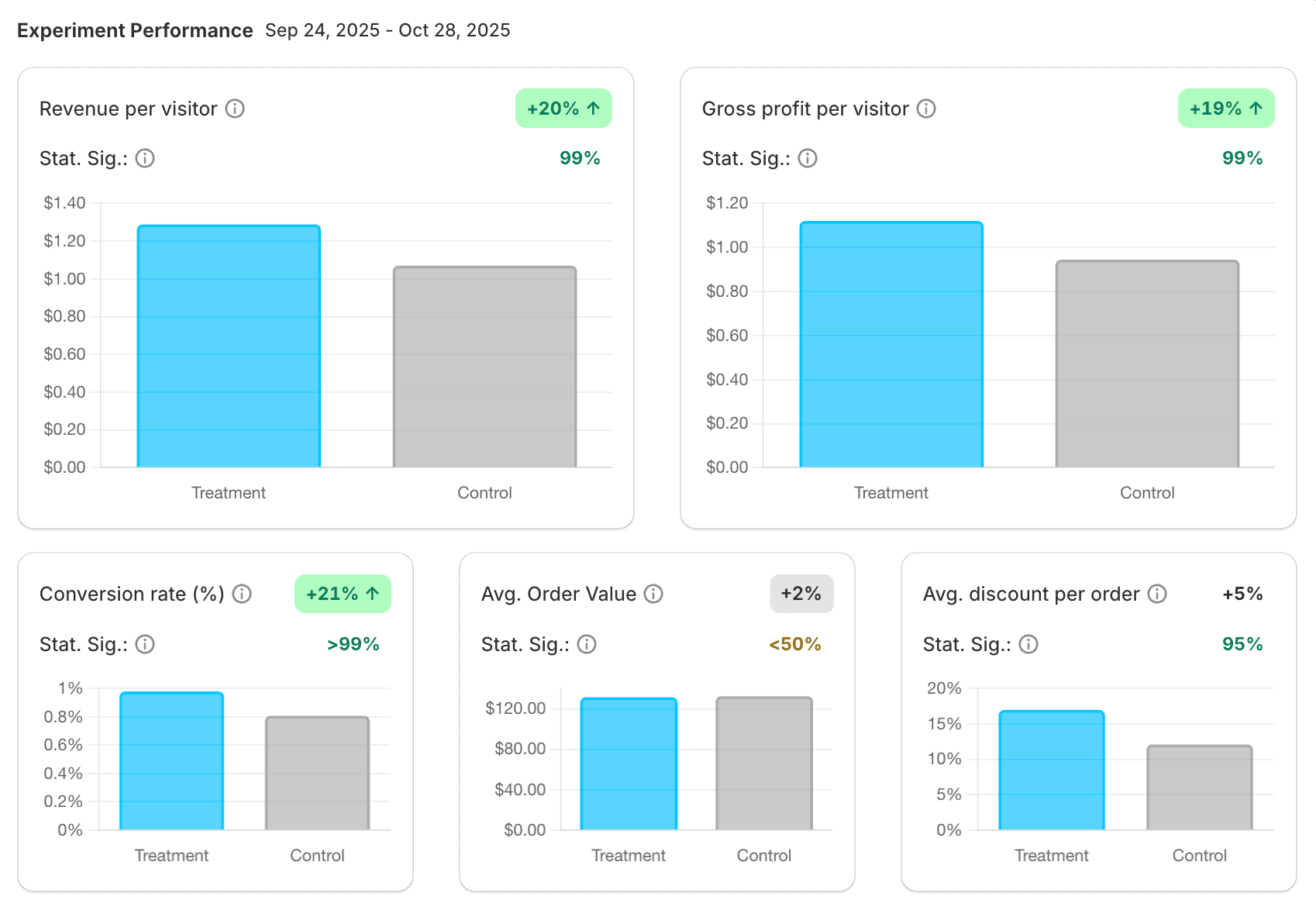 Promi lets you A/B test any discount, compare it to static or no discounts, measure its impact on key metrics, and see statistical significance.